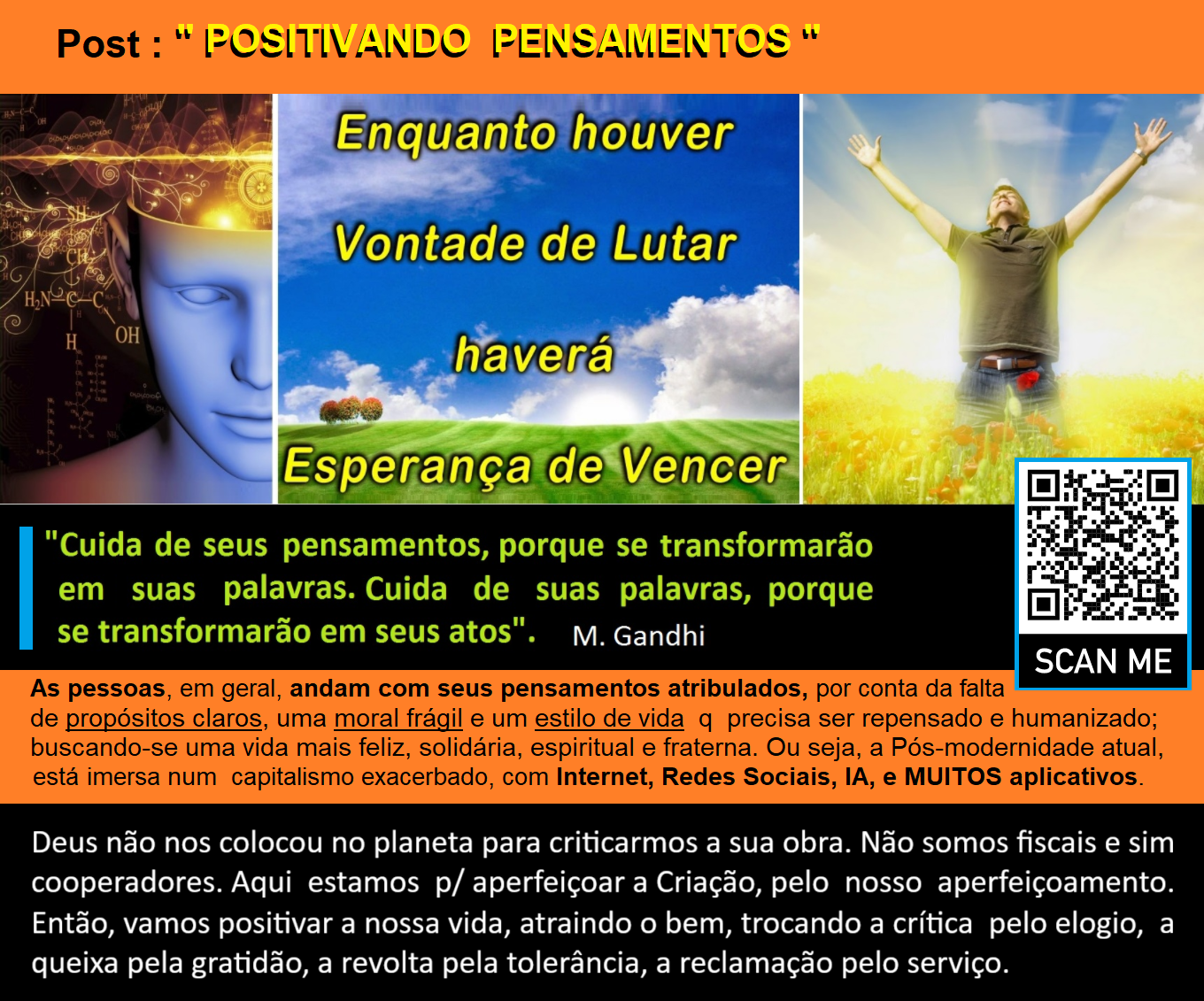 Positivando pensamentos, é a nossa contribuição efetiva contra a onda de baixo astral, de desesperança e tristeza que invadiu a mente de grande parte da população brasileira e até mundial. Há estudos estatísticos que demonstram q uma pessoa tem 60 mil pensamentos / dia e que 80% dos quais são de cunho negativo (medos, ansiedades, tristezas, etc…).